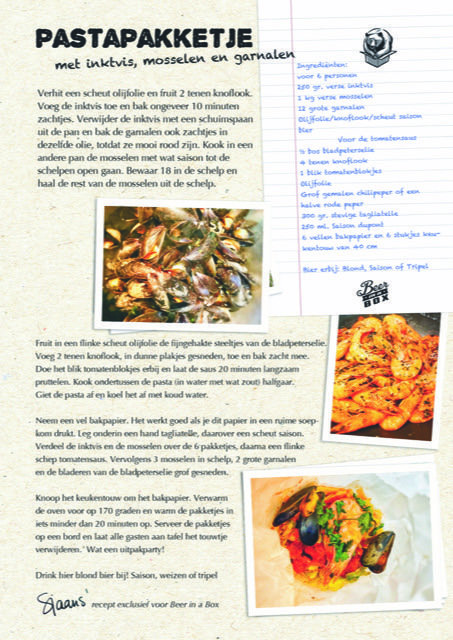 Neem een vel bakpapier. Het werkt goed als je dit papier in een ruime soepkom drukt. Leg onderin een hand tagliatelle, daarover een scheut saison. Verdeel de inktvis en de mosselen over de 6-pakketjes, daarna een flinke schep tomatensaus. Vervolgens 3 mosselen in schelp, 2 grote garnalen en de bladeren van de bladpeterselie grof gesneden.