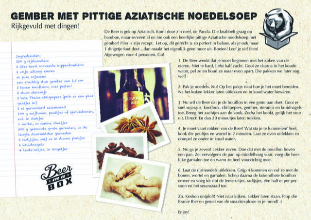 De Beer is gek op Aziatisch. Komt door z'n neef, de Panda. Die knabbelt graag op bamboe, maar serveert af en toe ook een heerlijke pittige Aziatische noedelsoep met gember! Hier is zijn recept. Let op, dit gerecht is zo perfect in balans, als je ook maar 1 dingetje fout doet...dan maakt het eigenlijk geen moer uit. Boeien! Leef je uit! Eten! Afgewogen voor 4 personen. Go!