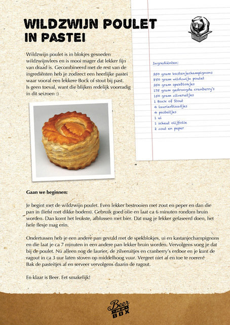 Wildzwijn poulet is in blokjes gesneden wildzwijnvlees en is mooi mager dat lekker fijn van draad is. Gecombineerd met de rest van de ingrediënten heb je zodirect een heerlijke pastei waar vooral een lekkere Bock of stout bij past. Is geen toeval, want die blijken redelijk voorradig in dit seizoen :)