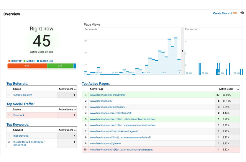 Dit is de top 10 van pagina’s op www.beerinabox.nl de afgelopen maand. Onze eigen crowdfund pagina staat met stip bovenaan. De bounce rate is netjes. De gemiddelde tijd op de pagina ook.