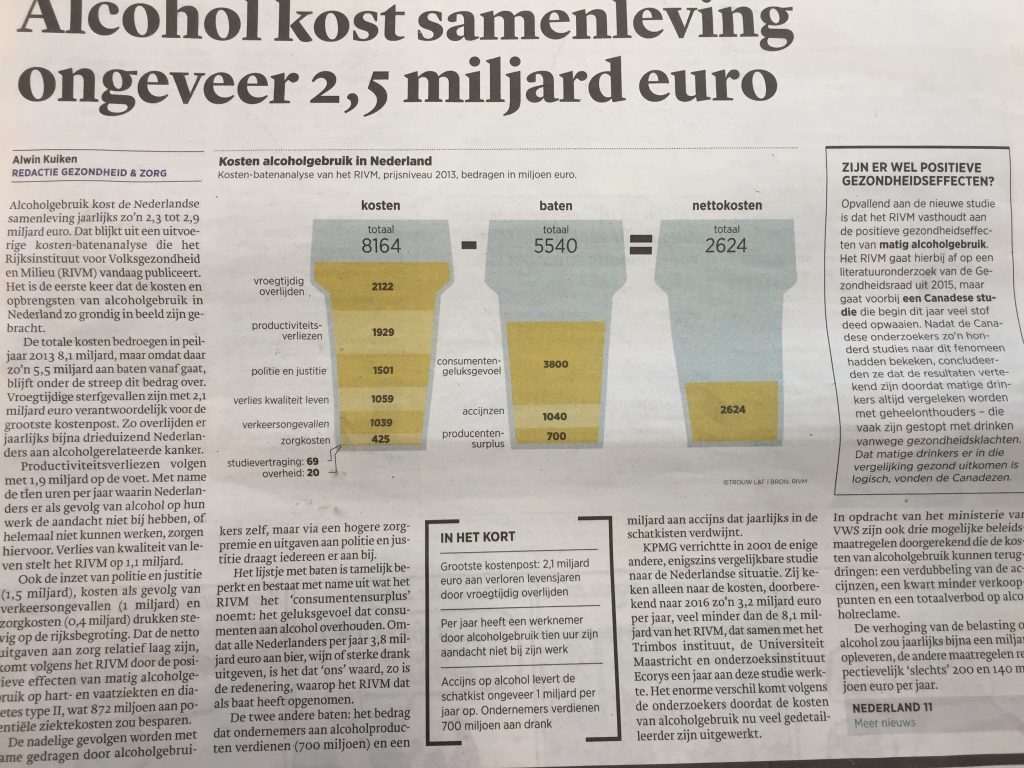 Zo, gromt de Beer. Dat is een boel geld! Als fervent dode bomen lezer gleed zijn oog over het artikel dat zowel Trouw als NRC publiceerden over de kosten van het alcoholgebruik in Nederland. Dit is voor het eerst grondig in beeld gebracht door het RIVM. Dit Nederlandse overheidsinstituut verzorgt informatie, monitoring en wetenschappelijke onderbouwing van het volksgezondheidsbeleid.