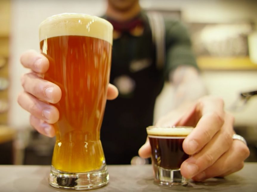 Starbucks doet innoveren en mixt espresso met een IPA. Mooi omschreven hoor: “a handcrafted beverage made with the unexpected combination of espresso and craft beer”. Juist! Verder is het; ““a truly interactive and unique beverage experience.” En om het helemaal af te toppen; “it’s a beautiful presentation with a fun twist, as pouring the shot over the beer creates a tantalizing, layered waterfall of espresso and craft beer in the glass.” Foto uit een still van de video, enorm trademarked door Starbucks (™)©(®)
