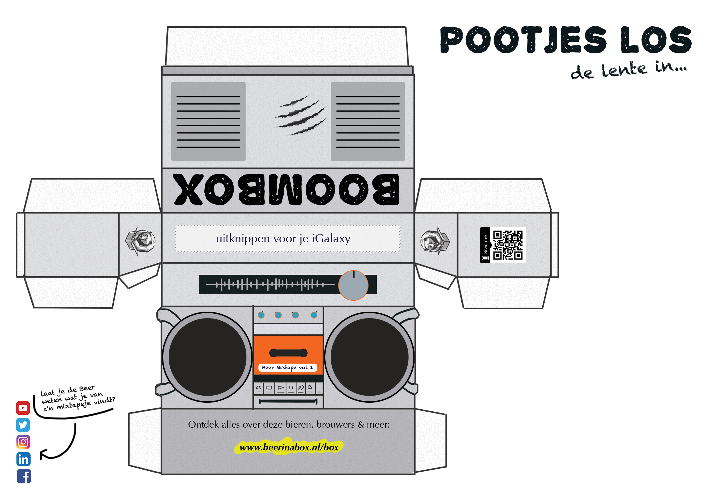 Zo geniet je er maximaal van: Vouw de Boom Box, zet je phone erin en scan de QR code... O nee, andersom: scan de QR code, vouw de Boom Box en zet je telefoon erin. Of nee, eerst knippen, dan vouwen, QR-code scannen, volume op maximaal zetten en telefoon in de Boom Box proppen. En dan kan je eindelijk los.
